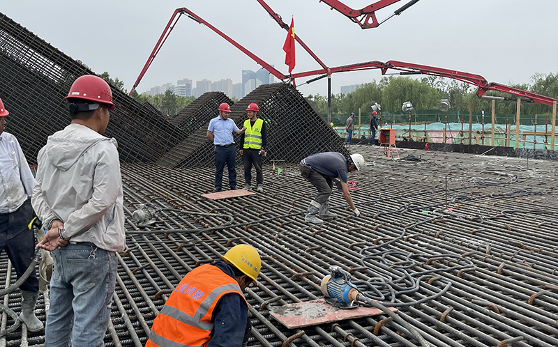 据悉,广德路跨南淝河桥的关键节点主桥8号承台,采用不规格的矩形切角型,其承台下设46根钻孔灌注桩基础,设计总砼浇筑方量8869.2m³,本次浇筑方量4198m³。因整体浇筑体量大、技术要求标准高,为保障工程质量,项目部精心组织、科学谋划,编制《大体积混凝土专项施工方案》并经专家多次研讨论证通过。浇筑前项目部全力协调人、材、机配给,对现场安全施工标准、钢筋制作绑扎、预埋件及冷却管布设、施工及养护措施等进行了详细技术交底,将任务分解到人,责任落实到人,扎实做好各项准备工作,以确保浇筑工作万无一失。