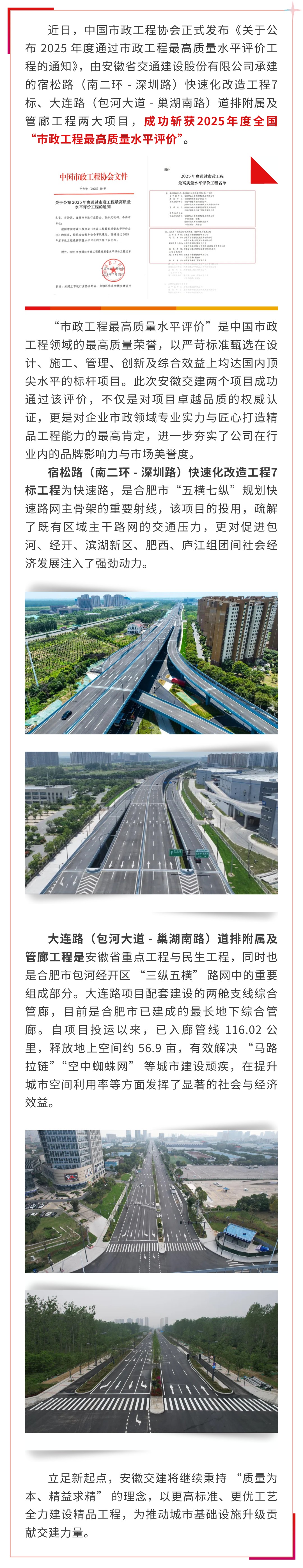 喜报!安徽Bevictor伟德两项目斩获2025年度市政工程最高质量水平评价