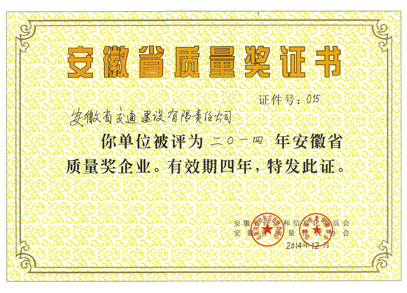 安徽省质量奖证书